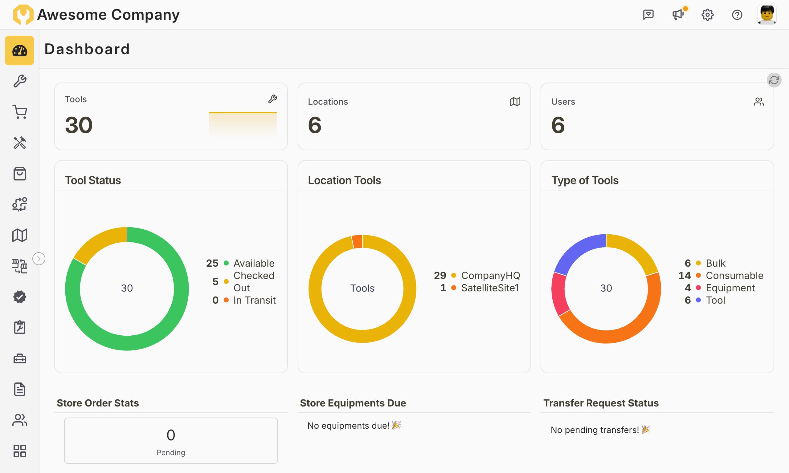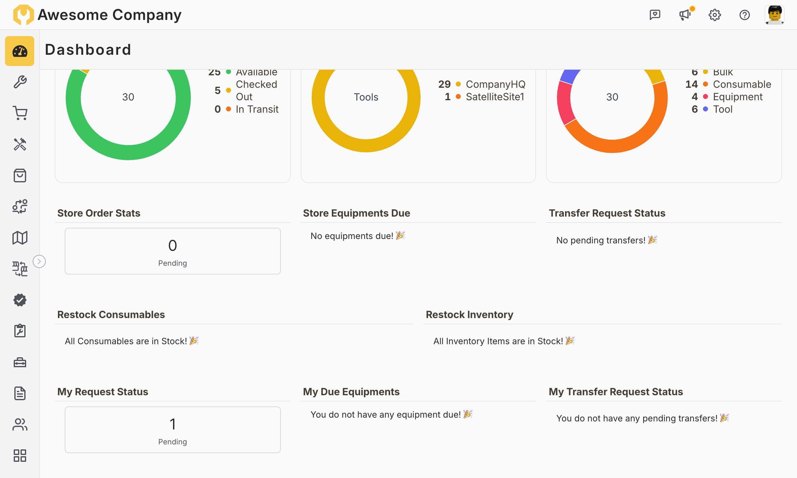 Interactive widgets Dive deeper into specific areas with charts and detailed lists for tool status, location distribution, and more.Direct links Access relevant pages effortlessly â jump to orders, equipment, requests, and transfers directly from the widget.Personalized view Focus on what matters most. See equipment and requests specific to you, along with their statuses and direct links.