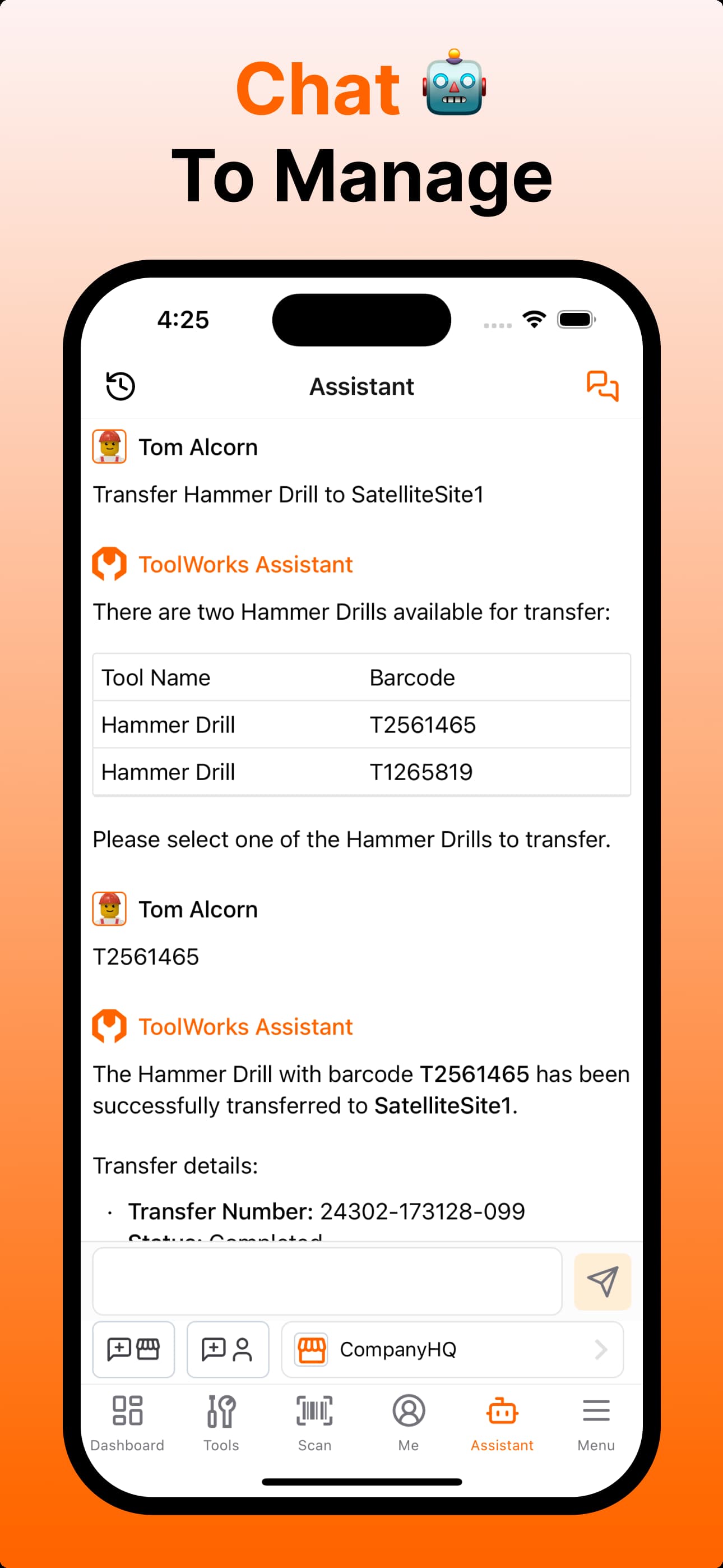 If your crew knows how to send a text, they can use ToolWorks. Our AI Copilot allows users to request tools, check availability, or schedule a transfer using simple, natural language. There's zero learning curve, which means faster adoption and immediate productivity gains.